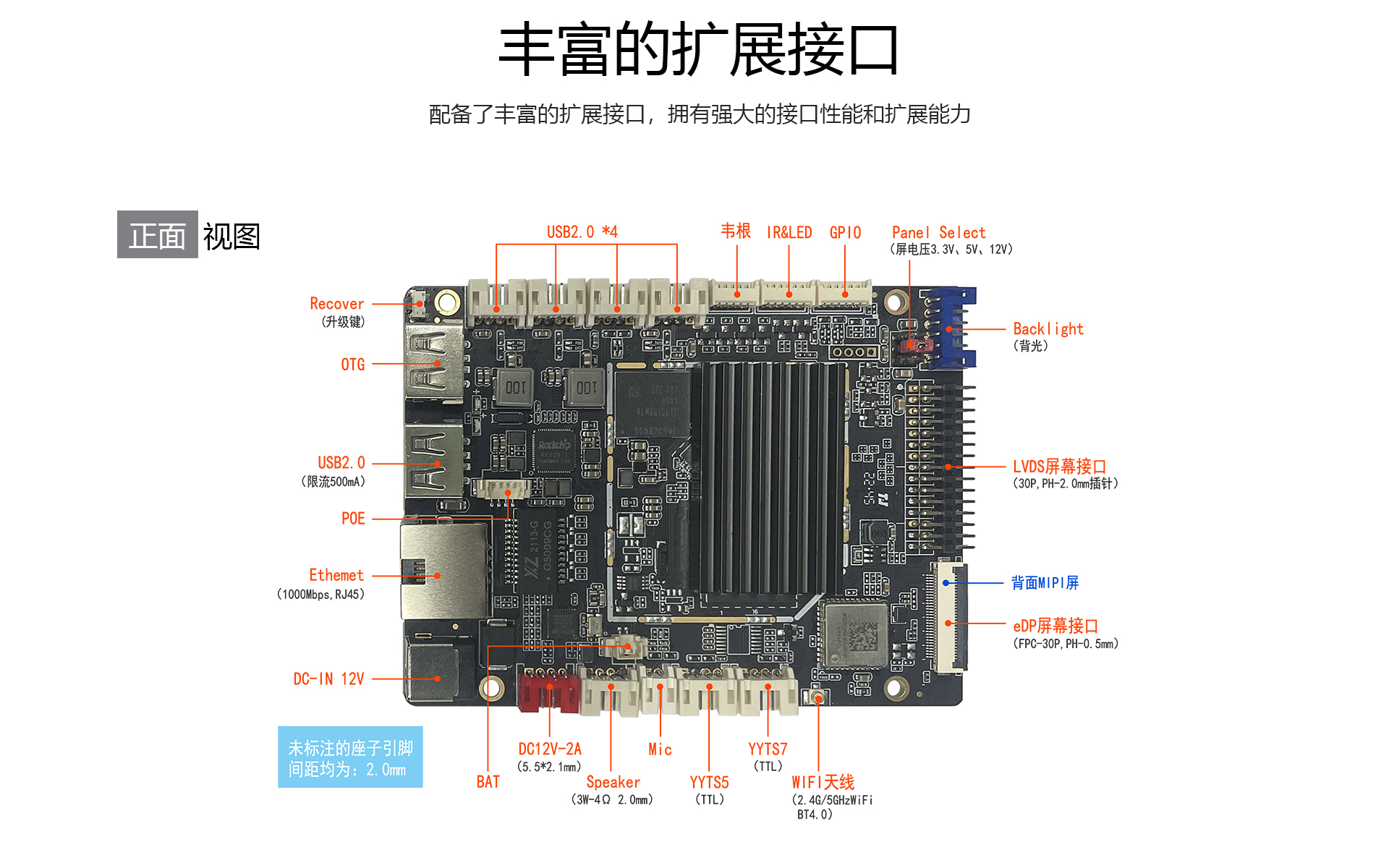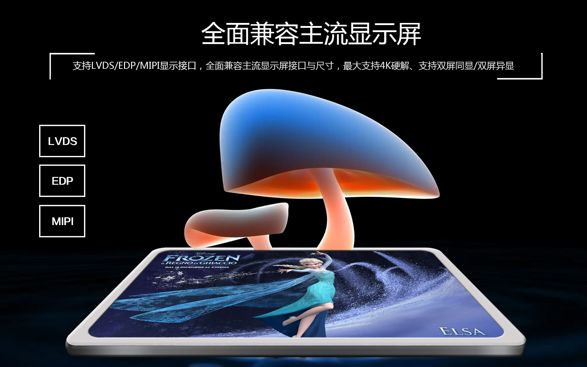 显示输出1个单/双路LVDS、1个eDP、1个MIPI