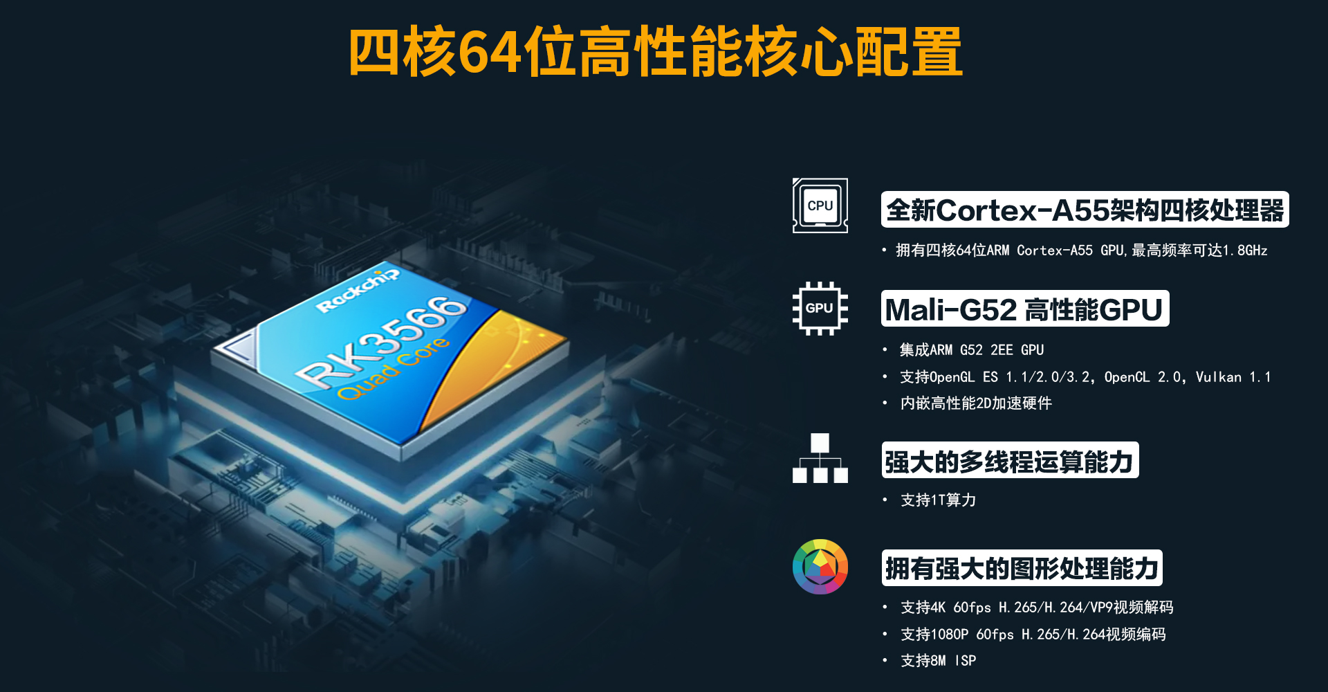 CPU瑞芯微 RK3566, 四核 Cortex-A55,主频1.8GHz